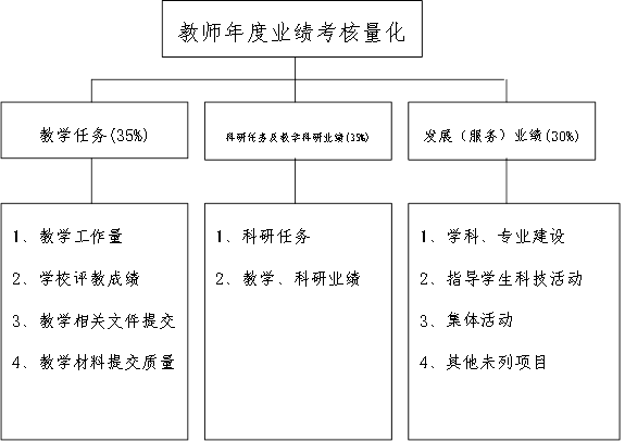 3、根据学校相关考核办法及学院的实际情况,该考核分配方案按专任教师、行政、教辅和辅导员4个考核组分别进行考核,切块分配。专任教师考核以定量考核为主,行政等其他人员以定性考核为主。考核时间从每年的12月1日始,至第二年的11月30日止。