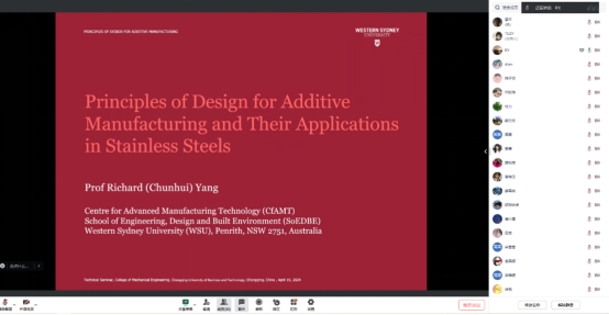 4月19日下午,澳大利亚西悉尼大学杨春晖教授应邀为我院师生作题为《3D金属打印与增材制造》的线上学术讲座。会议由yl23455永利集团院长杜力主持,副院长李平及60余名研究生参加。