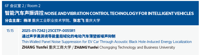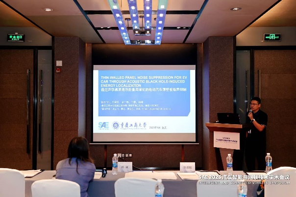 张云飞博士在“智能汽车声振调控”论坛上作了主题为“Thin-Walled Panel Noise Suppression for EV Car Through Acoustic Black Hole-Induced Energy Localization(通过声学黑洞诱导能量局域化的电动汽车薄壁板噪声抑制)”的报告。报告聚焦电动汽车噪声控制核心技术,展现了我校在智能车辆工程领域的研究实力与创新成果,赢得了参会者的广泛关注。借此大会搭建的高端交流平台,张云飞博士同步向现场专家学者介绍了重庆工商大学智能车辆工程专业的历史沿革、学科定位、团队情况与特色优势,进一步扩大了专业的行业影响力。此外,张博士还与参会嘉宾就报告中的技术细节、应用场景及未来研究方向展开深入探讨,为后续学术合作埋下伏笔。