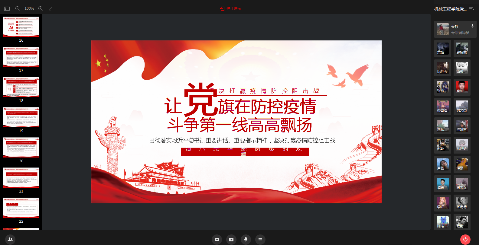 2020.6.29日,yl23455永利集团党总支学生一支部开展了“让党旗在防控疫情斗争第一线高高飘扬”为主题的微党课活动,支部书记秦杉老师担任主讲人,支部34名党员参会。