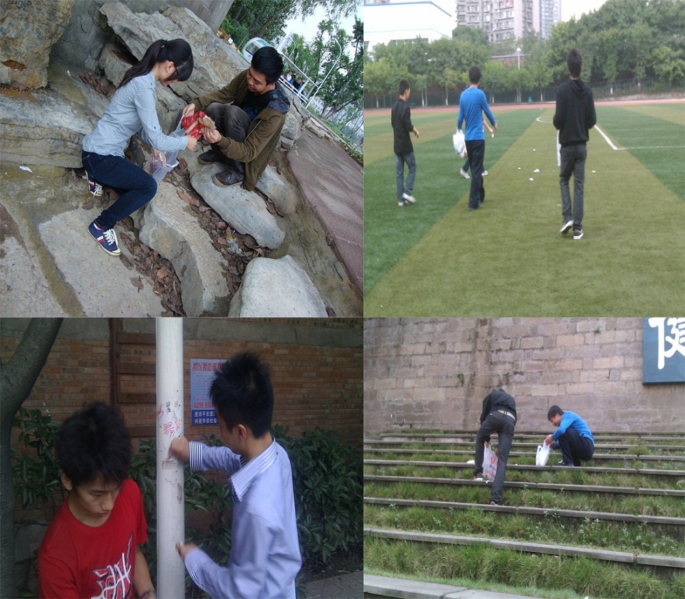 阴雨绵绵的秋季,渐寒的天气阻止不了儿女爱母的热心和激情,虽然下了点小雨,但机械学子却没有丝毫退缩,以饱满的热情积极行动着。为了更加有效的完成本次活动,同学们分成了三个小组,分头行动。在美容行动中,大家仔细的搜索着校园的每一个角落,争取不让一个垃圾漏网;无论是男生还是女生,大家都不退缩,争先恐后地抢着做第一个将垃圾拾起的人,让自己拾垃圾的口袋装的比别人的满;无论是纸屑还是塑料袋,甚至是那些没有吃完的水果和煎饼,大家都不嫌脏,依然主动伸出双手将其拾起。在两个小时的时间内,同学们将垃圾一包一包的送进垃圾桶,让母亲的肌肤又焕发出年轻的光泽。看着自己的劳动成果,同学们也都纷纷露出了笑容,为祖国的繁荣而高兴,为母校的靓丽而激动!