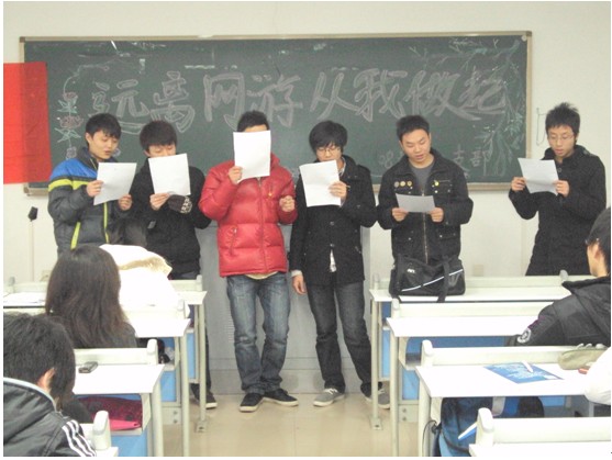 本次活动是在学院加强学风建设,开展网络游戏专项整治的大背景下举行的。活动在嘹亮的团歌中拉开帷幕,班长朱亚军仔细介绍了学院专项整治网络游戏实施方案。然后,同学们畅所欲言,纷纷发表了对于网络游戏的认识,网络游戏的好处和坏处,尤其以学习委员李旭对网络游戏的看法最为精辟:好男儿应该有所为而有所不为。活动中穿插了一些团队协作游戏,同学们都积极参与其中。活动在歌曲《没有网游的日子》中达到高潮,同学们以歌曲的形式表示了他们对远离网络游戏,好好学习的决心。最后,在承诺书上大家纷纷签下了自己的名字,远离网游,从我做起。