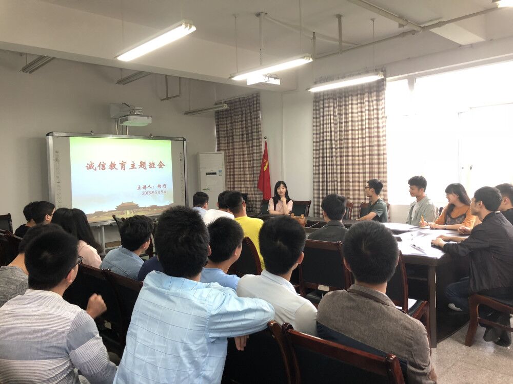 2018年5月9日下午3点30分,14级包装一班、机制一、二、三、四班和机电一、二班的贷款同学在90711学院会议室参加了诚信教育主题班会。除了4位同学确因实习无法到场之外,其余35位同学都认真听取了辅导员向巧老师关于“诚信”的见解和强调。