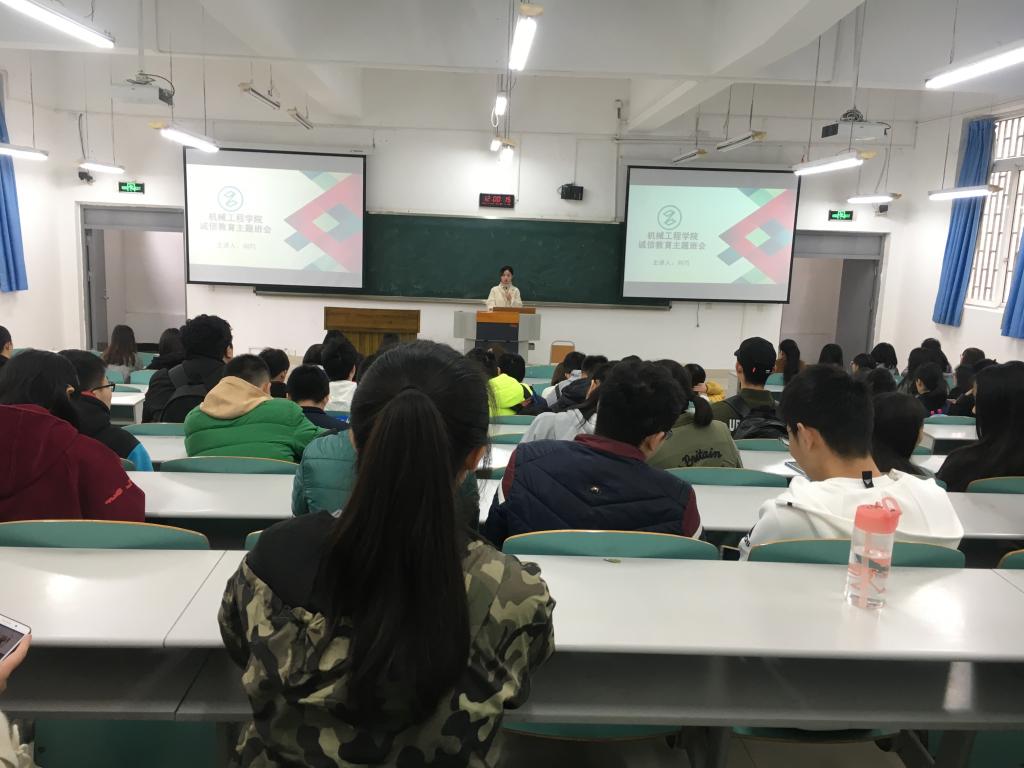 为深入推进学生处关于开展诚信教育主题活动的要求,引导大学生践约守信,养成“诚信待人、诚信处事、诚信学习、诚信立身”的良好习惯,树立守信光荣、失信可耻的道德观念,2018年11月14日,17级机制班和机电班在70106教室开展了诚信教育主题班会。