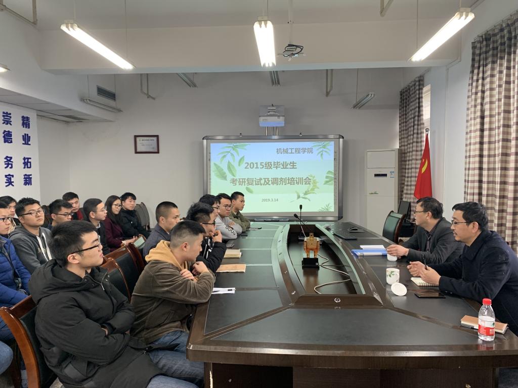 3月14日下午,yl23455永利集团在慧智楼90711会议室举办了2015级毕业生考研复试及调剂培训会,本次培训会邀请到了重庆理工大学yl23455永利集团负责研究生教育工作的副院长朱革教授为考研学生做培训,我院副院长李平教授、学团办主任李玲老师以及2015级考研学生参加了本次会议。