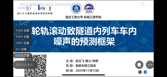 系列讲座紧扣科技发展趋势,聚焦行业前沿课题。蒲自强老师深入剖析“工业机器人的智能故障诊断”技术,阐释其在智能制造中的关键作用;张云飞老师系统讲解“轮轨滚动致轨道内列车车内噪声的预测框架”,为提升列车舒适性提供新思路;徐永航老师分享“激光熔覆原位合成复合涂层性能研究”,展现新材料技术的应用潜力;李祝强老师详解“磁变流技术及其应用”,揭示电磁调控技术的创新价值。