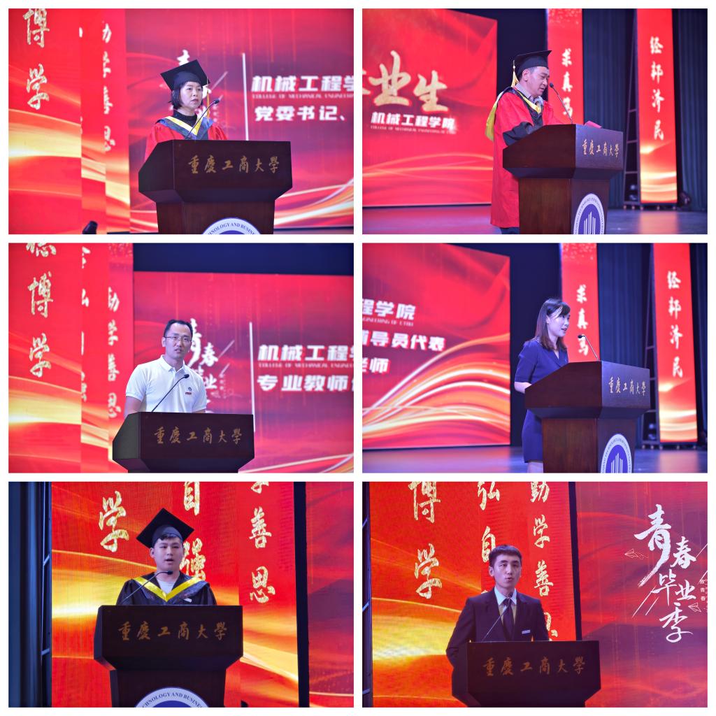 梁强老师作为教师代表发言,强调在专业能力上“打铁还需自身硬”,鼓励毕业生在职业发展上“趁热打铁”;袁娅婷老师作为辅导员代表发言,表达了对同学们的不舍,为大家的成功喝彩。张固同学和赵兴龙同学分别作为毕业生代表和在校生代表发言,感恩学校、学院的培养,立志努力向成长为具有家国情怀、工匠精神的机械人奋斗。