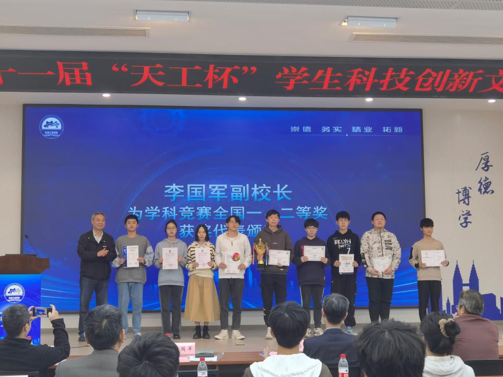 李国军副校长给今年以来学院开创性获得学科竞赛国家级一等奖的同学们一一颁奖,与会3位职能部门领导分别为学院2021-2022学年度获得学科竞赛国家级二三等的学生代表们颁奖。杜力院长揭晓了20届学生科技创新文化活动月最佳组织奖获奖班级。