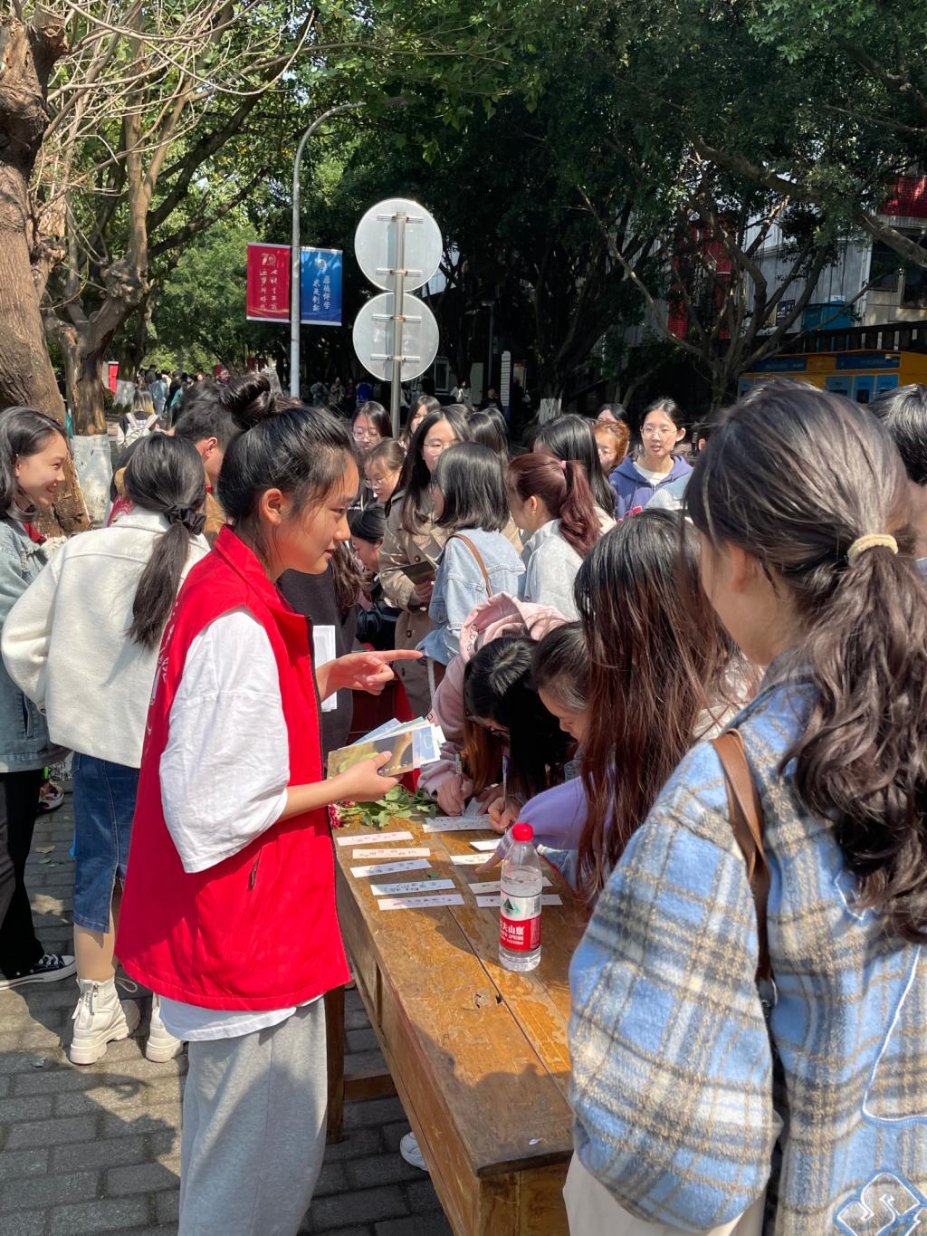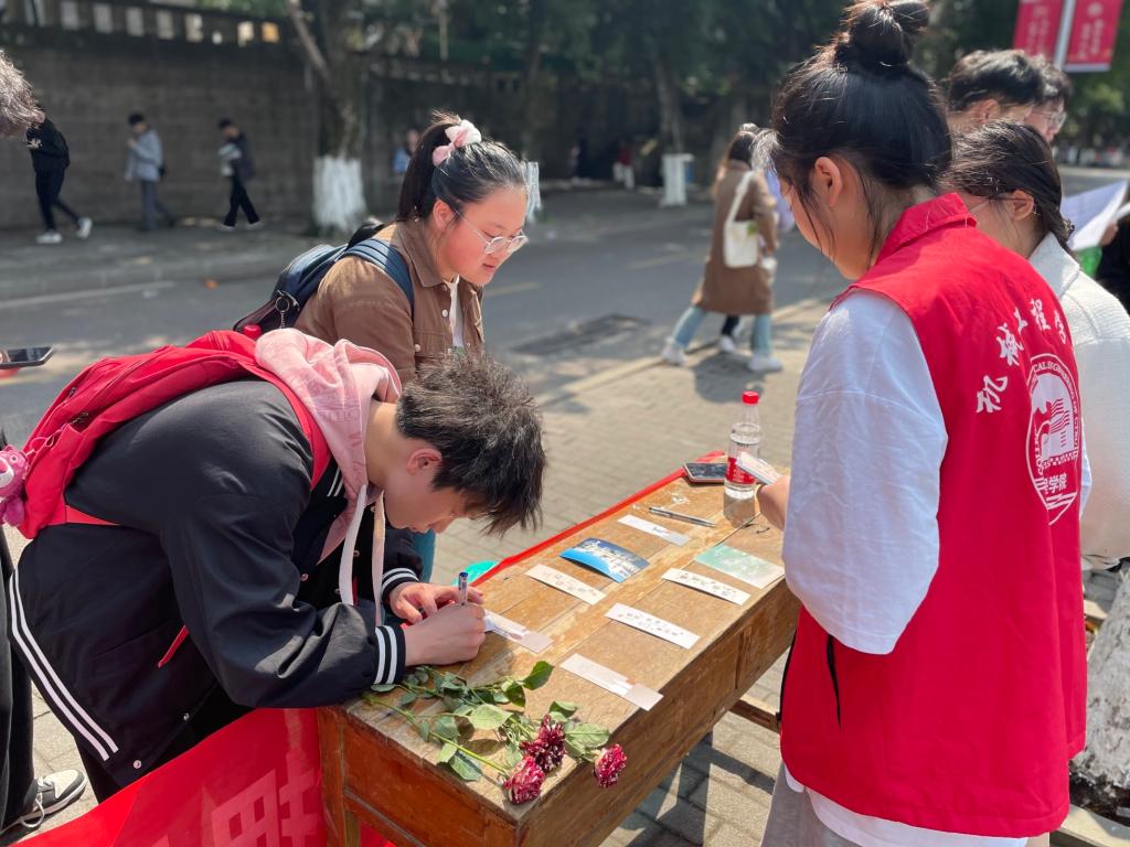 现场通过志愿者的介绍,免费抽取明信片获得玫瑰花并交换祝福的活动方式吸引了同学们的参与。纸短情长,同学们在明信片上写上自己想说的话,简短的几行文字传递给其他同学最真挚的祝福。大家在明信片上写下自己对他人生活或学业的祝福,且在志愿者的帮助下自己的心声也能够传达给同校还未相识的其他同学们。参与活动的同学在收到他人的明信片祝福后也表现出了惊喜、满足的神情。小小的明信片承载着一个人的温暖,传递到参与活动的另一个人,有着非凡的意义。小小的明信片,化身成友谊的信使,架起了同学们联系的桥梁。