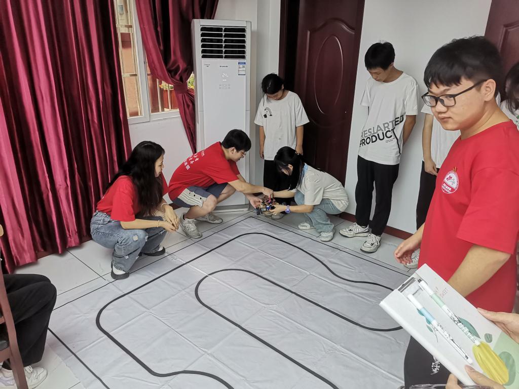 宣讲团成员张明宇通过趣味提问的方式,激发青少年们对智能车的兴趣,顺利展开科普宣讲。课上,张明宇用“图片+视频+实物”的形式,生动形象地展示了负压电磁车、独轮摄像头车和红外传感寻迹车等智能小车相关内容,并结合arduion软件为青少年们现场演示了红外寻迹智能车寻迹运行,用青少年们易于理解的语言深入浅出地讲解了寻迹代码的含义以及机器各个工作部位连接线路的作用,收获课堂上的一阵阵惊叹。讲解结束后,青少年们亲自动手参与小车调试,切身体验机械的神奇。