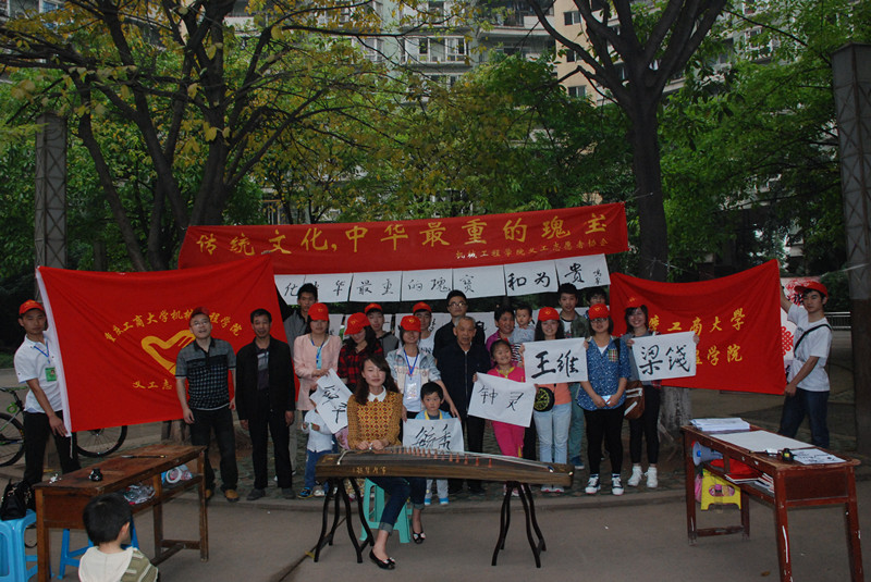 为了弘扬中华民族优秀的传统文化,本次活动准备了笔墨纸砚和象棋等活动用品。最先出场的唐佳莹弹奏了优美的古筝。紧接着两位老大爷挥毫泼墨,表演了书法,颇有大师风范。小伙伴们惊叹之余,纷纷要求为自己题字,一些完成了的书法字被挂起来,供居民欣赏。活动结束后,志愿者打扫现场,不留下任何垃圾和杂物。