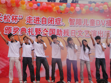 将爱传播,不求回报,只愿所有的自闭、智障儿童能够快乐健康成长,只愿再多一份爱的阳光铺撒在这些特殊的儿童身上。携带着这份信念、这份责任,yl23455永利集团60余名优秀志愿者及09级辅导员张春媚老师一大早8点钟便来到了乐一融合幼儿园,和这些智障小朋友们一同参加了“长松杯”走进自闭症、智障儿童DV摄影大赛颁奖典礼暨全国助残日文艺演出活动。