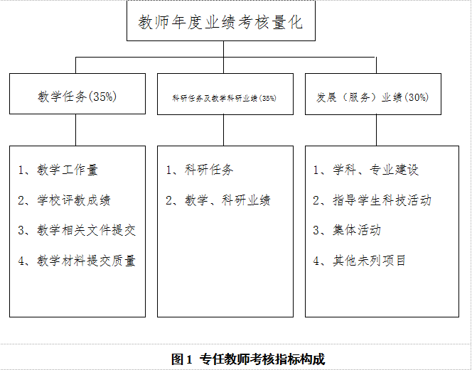绩、发展(服务)业绩等三方面对专任教师完成的工作进行量化考核,以期全面、客观和真实地反映教师的年度业绩,考核主要指标及占比见图1。