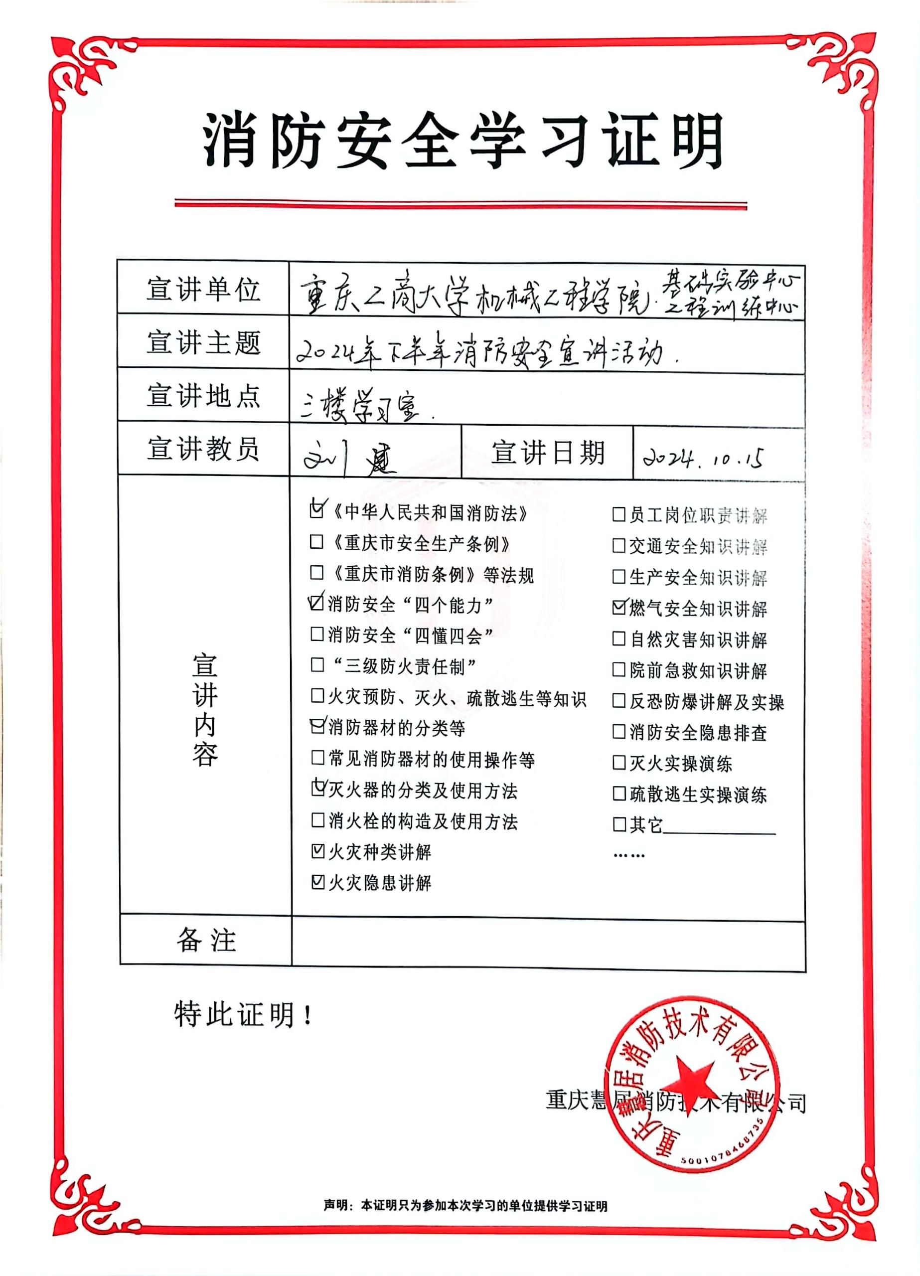 为提升教职员工和学生消防安全意识和应急处理能力,2024年10月15日,学院机械基础实验教学中心和工程训练中心邀请重庆慧居消防刘建教官,在工程训练中心举行实验、实习消防安全知识培训。学院基础实验教学中心、工程训练中心全体教师、中心创客入驻企业、学院机械师、汽车人、星包装社团成员以及超声加工、3D打印学生创客团队队员等30余人参加了此次培训。