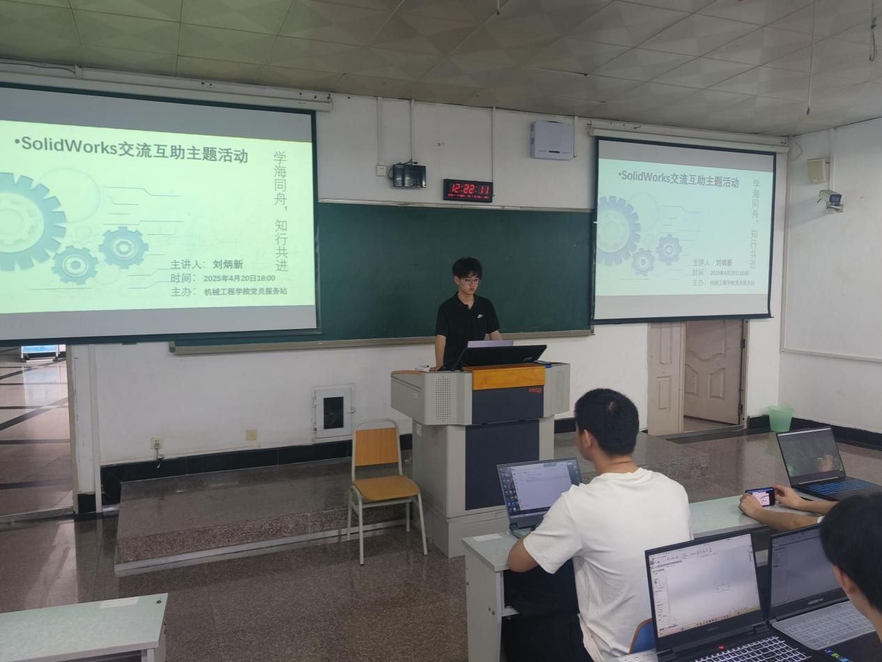 2025年4月20日下午,重庆工商大学yl23455永利集团党员服务站在慧智楼90209教室成功开展"学海同舟,知行共进"互助学习系列活动之SolidWorks建模专题培训。活动特邀重庆市大学生先进成图技术大赛二等奖获得者——23级机电一班刘炳新同学担任主讲,采用"线下实操+线上直播"双模式同步进行,累计吸引百余位同学参与学习。