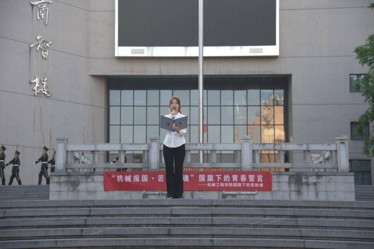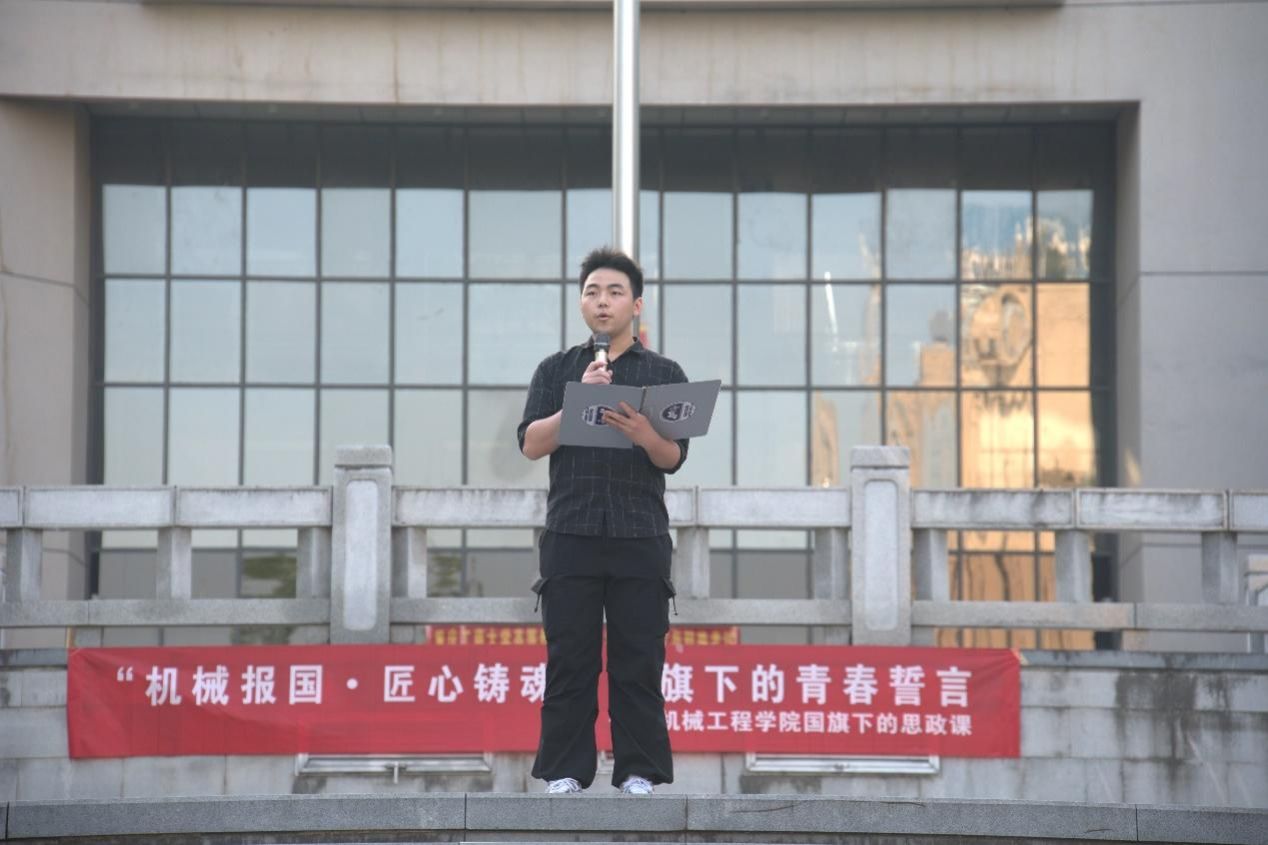 活动在庄严的升旗仪式中拉开序幕。国旗护卫队入场,全体师生肃立注目,伴随着雄壮的国歌声,五星红旗冉冉升起。学生代表胡富杰发表国旗下演讲。他从青年学子视角阐述了对“机械报国,匠心铸魂”的理解,表达了新时代大学生服务国家发展的决心和热情。