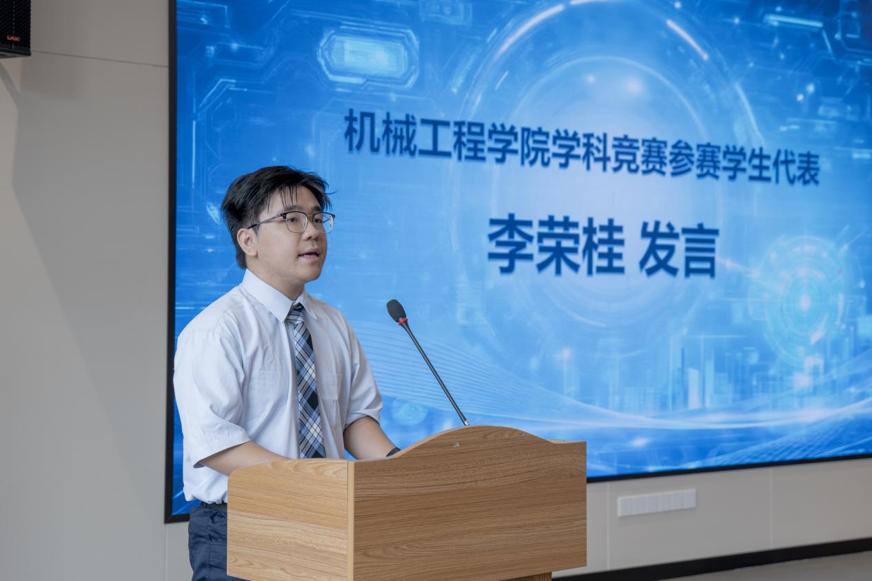 学院学科竞赛参赛学生代表李荣桂同学随后发言。他分享了自己参与学科竞赛的感悟与体会,表达了对学院提供平台和老师辛勤指导的感谢。他号召全体同学积极把握“科创月”的契机,不要被动等待,通过行动一步步靠近真正的热爱,相信坚持的力量,在热爱中成就自己。