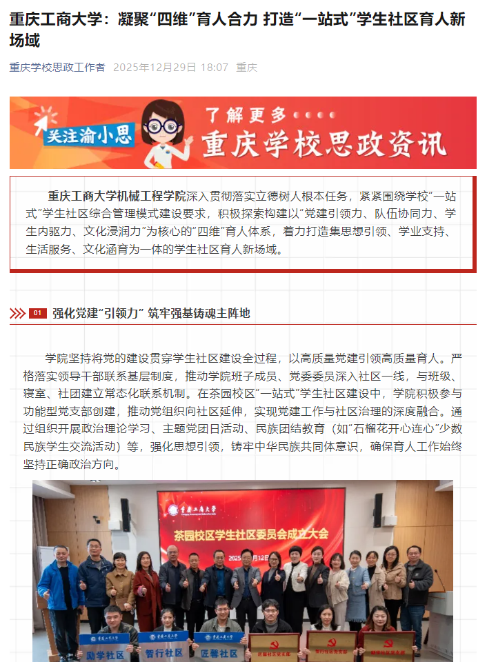 以上报道生动呈现了我校在“一站式”学生社区建设中的创新实践,体现了我校在深化“三全育人”、推动思想政治工作高质量发展方面的积极作为。