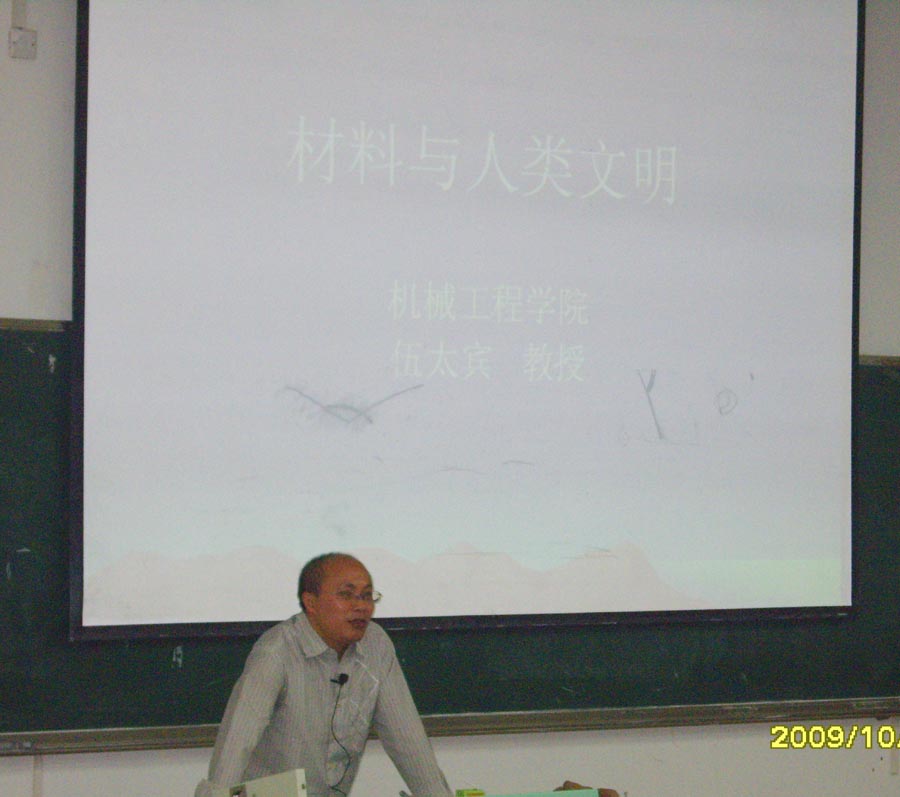 2009年10月16日上午,机械学院在兰花湖校区为09级新举办了首次专业知识学术讲座,由学院的伍太斌教授主讲。