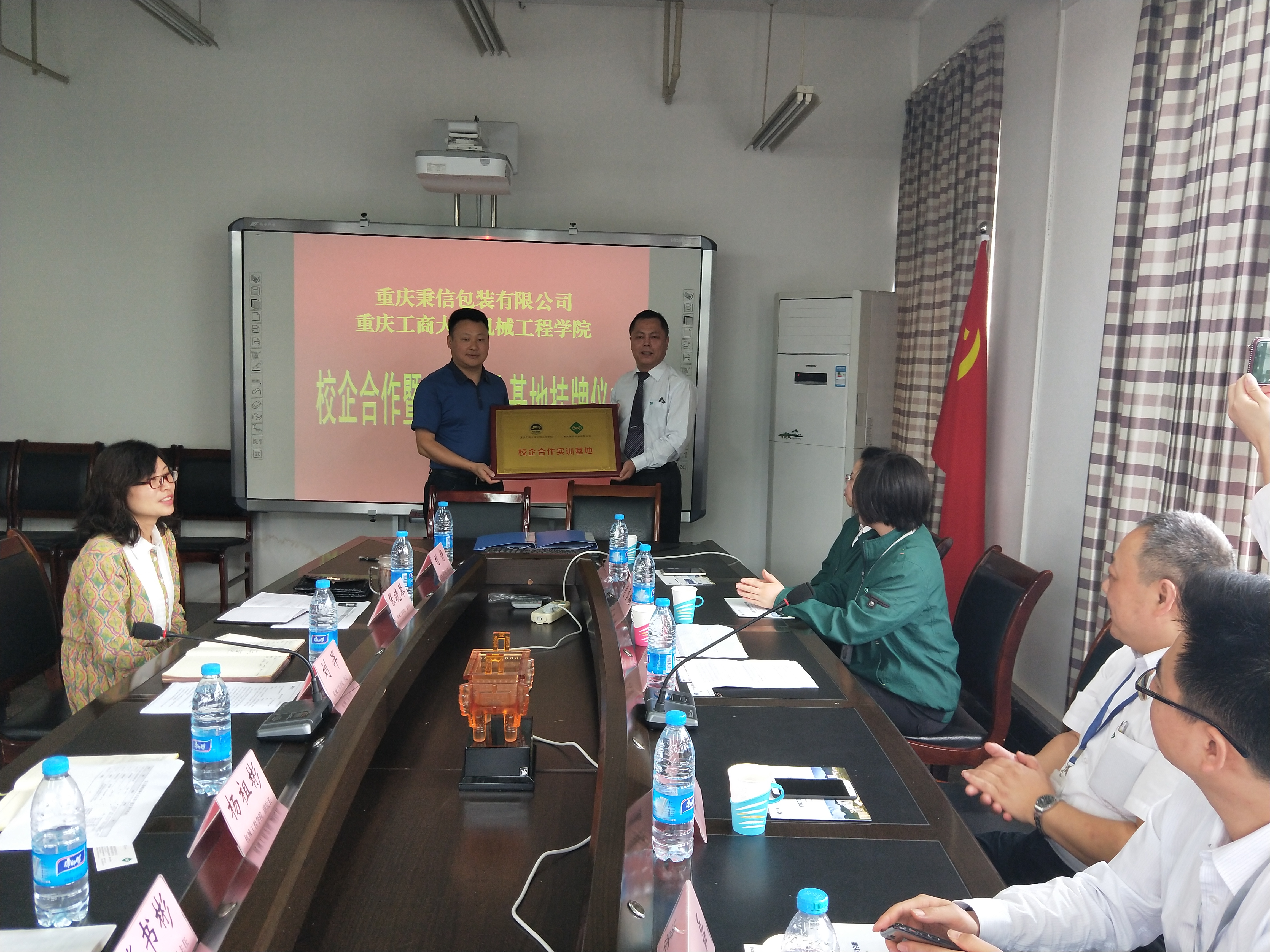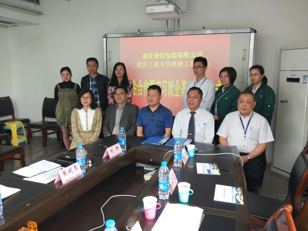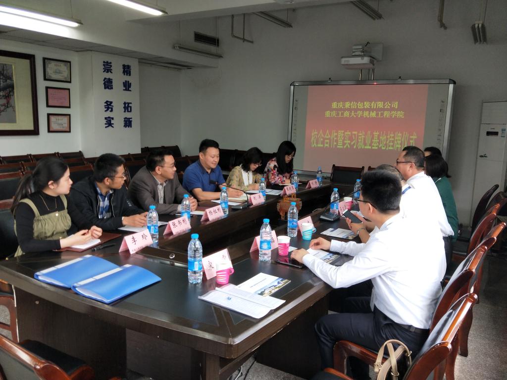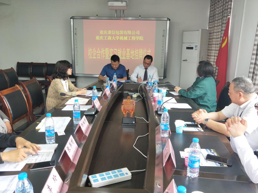 2018年4月27日上午,重庆工商大学yl23455永利集团、重庆秉信包装有限公司校企合作签约及授牌仪式在yl23455永利集团会议室举行。学院分管教学副院长杨祖彬教授主持签约及授牌仪式,学院党总支刘洋书记和张晓琴副书记、党政办刘静主任、包装工程系张书彬主任、学团办李玲主任,秉信包装有限公司西南事业部吴文雪总经理、温建厂长、品管科康谷科长、营业科梁磊科长、人资科肖雪梅科长、校企合作项目负责人宋春霞等参加了签约及授牌仪式。