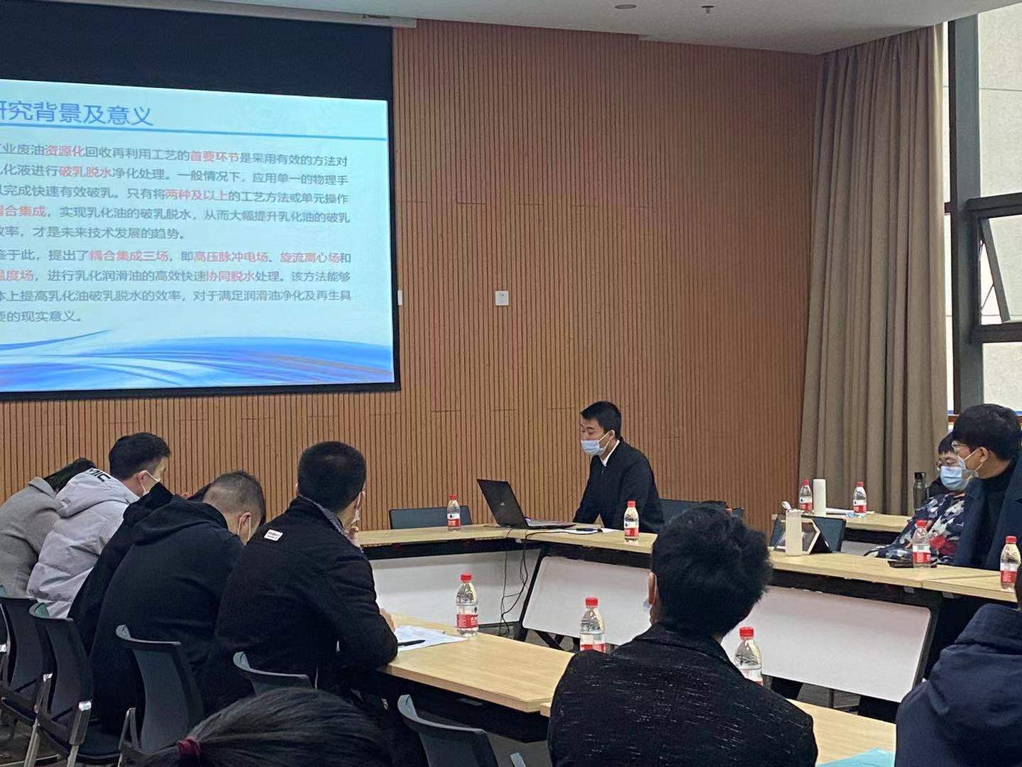 2020级研究生罗鑫从研究背景及意义、工作原理、装置简介、装置创新点及运用前景这五个方面介绍了一种高效的工业废油热—电双级真空分离装置。结合自己的研究方向,着重介绍了乳化液是如何进行破乳脱水,以及乳化液脱水在废油回收再利用中的地位,并深入分析了该装置在结构和理论上的创新,启迪了同学们的创新思维。